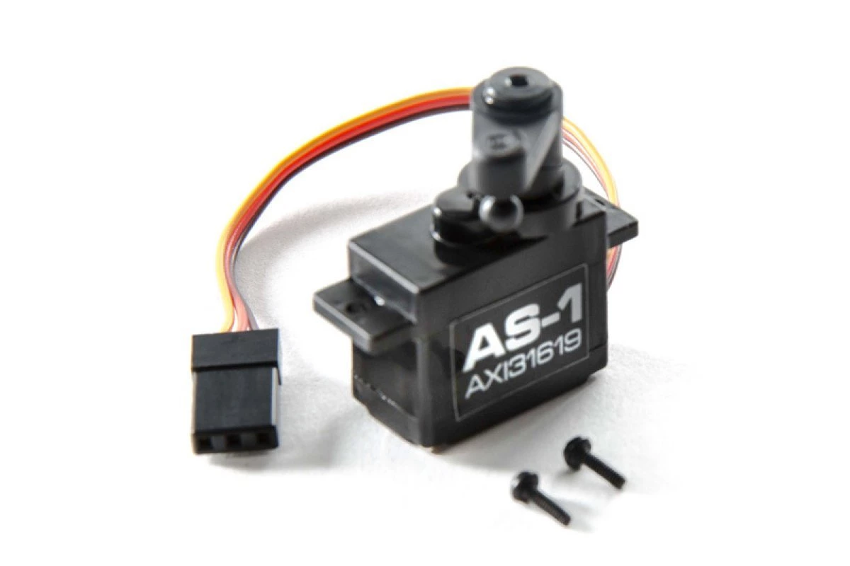 AS-1 micro servo with servo horn, servo saver, and mounting screws.