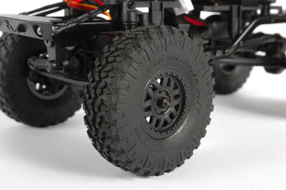 - Coilover shocks with simulated reservoir and durable plastic suspension links deliver proven Axial crawling performance